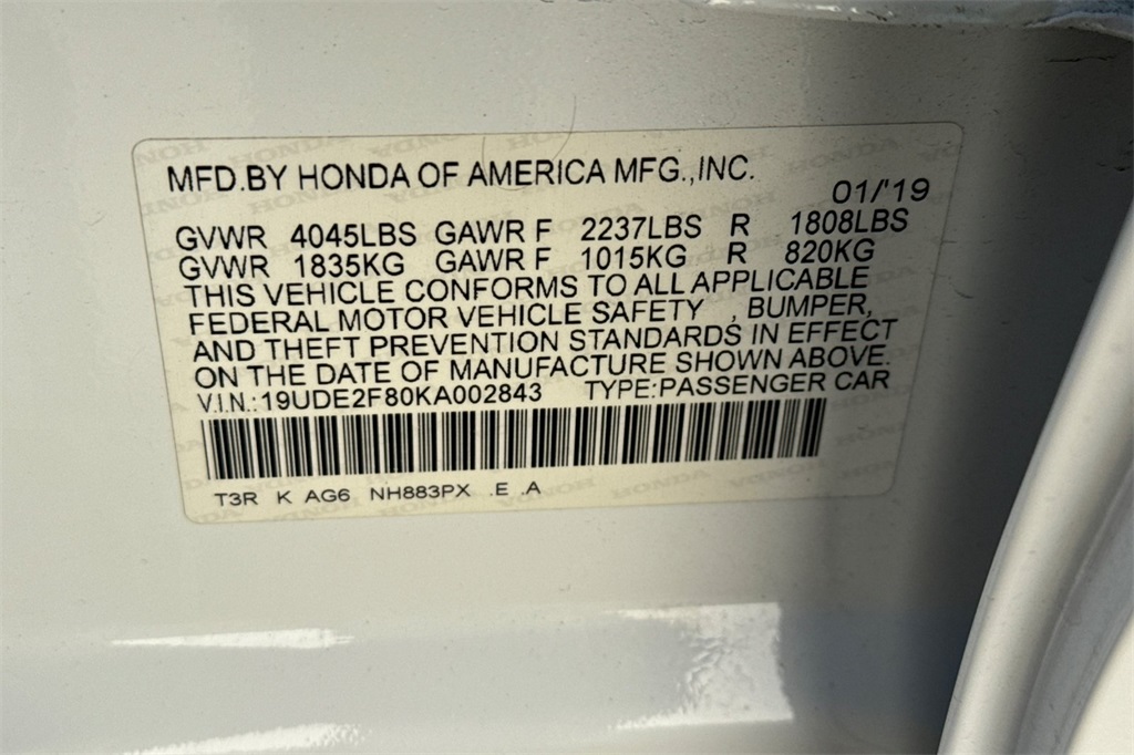 - VIN : 19UDE2F80KA002843